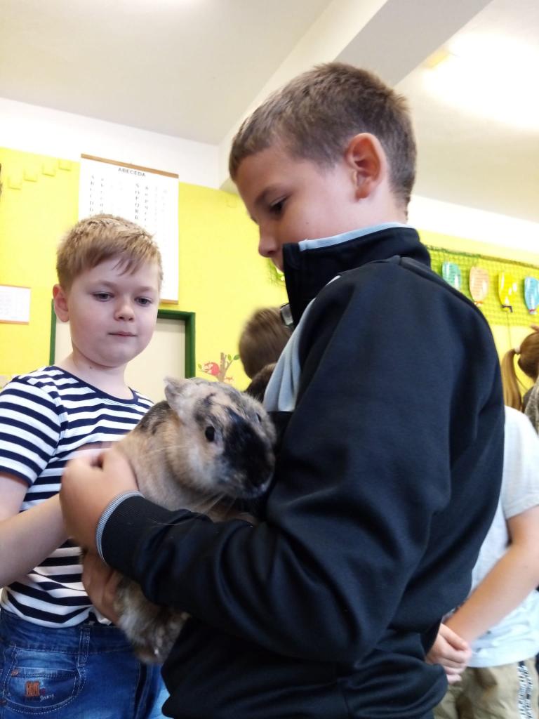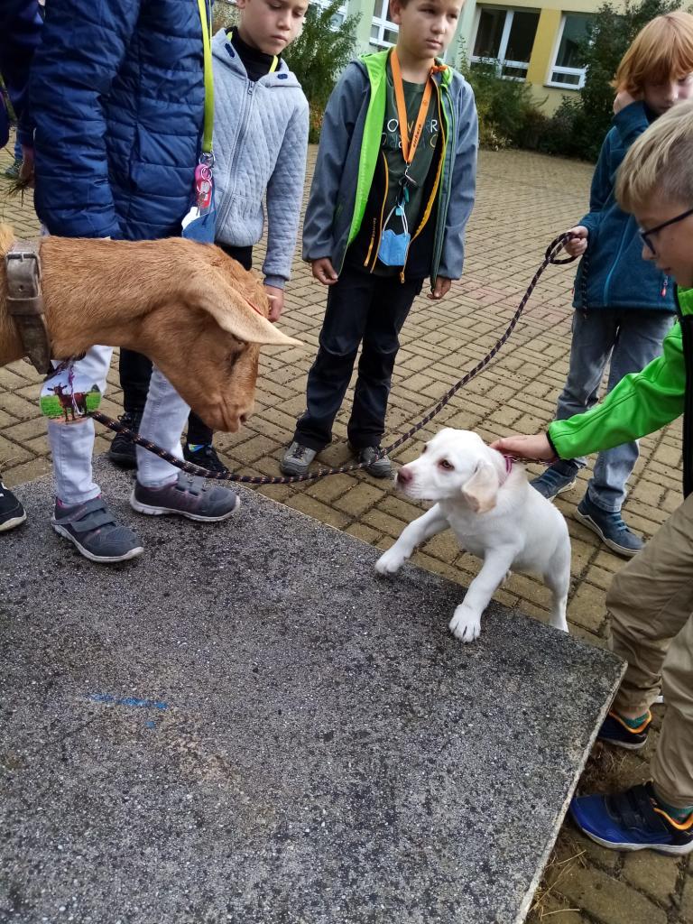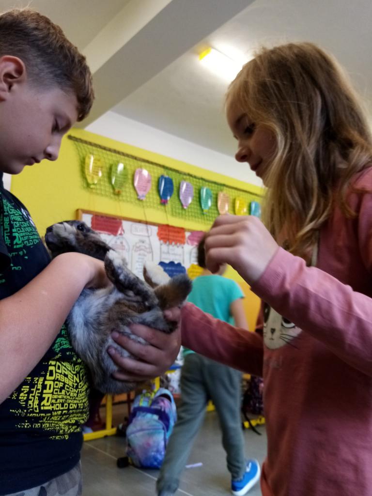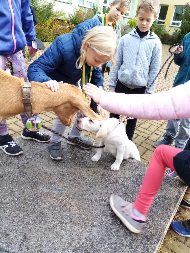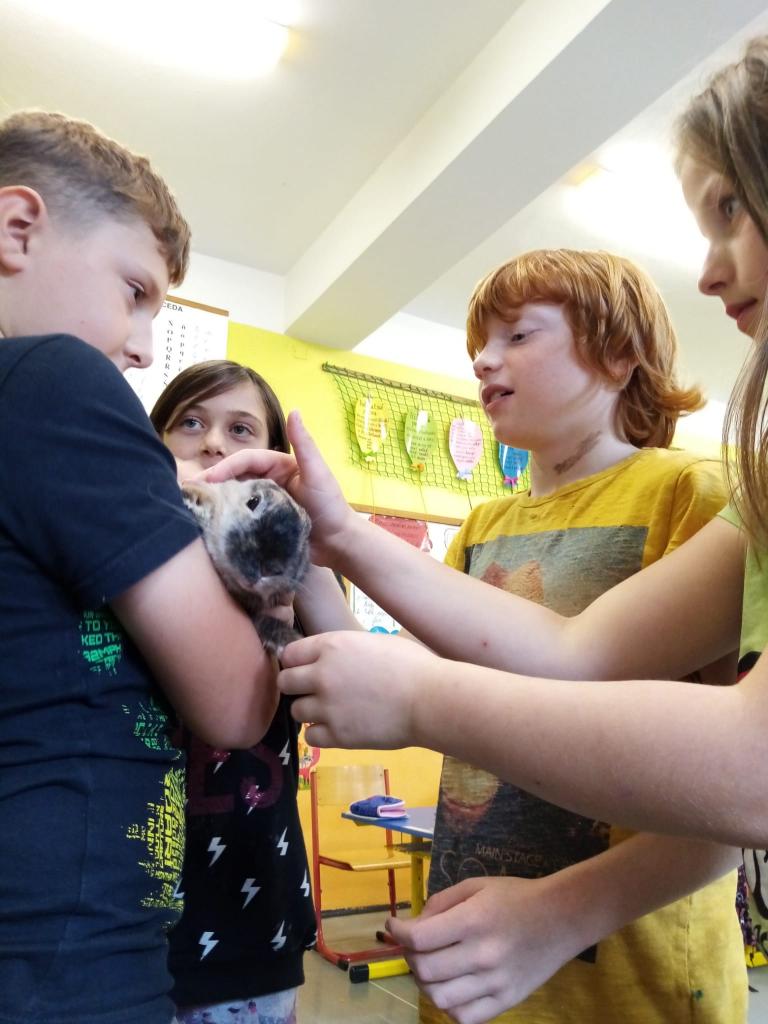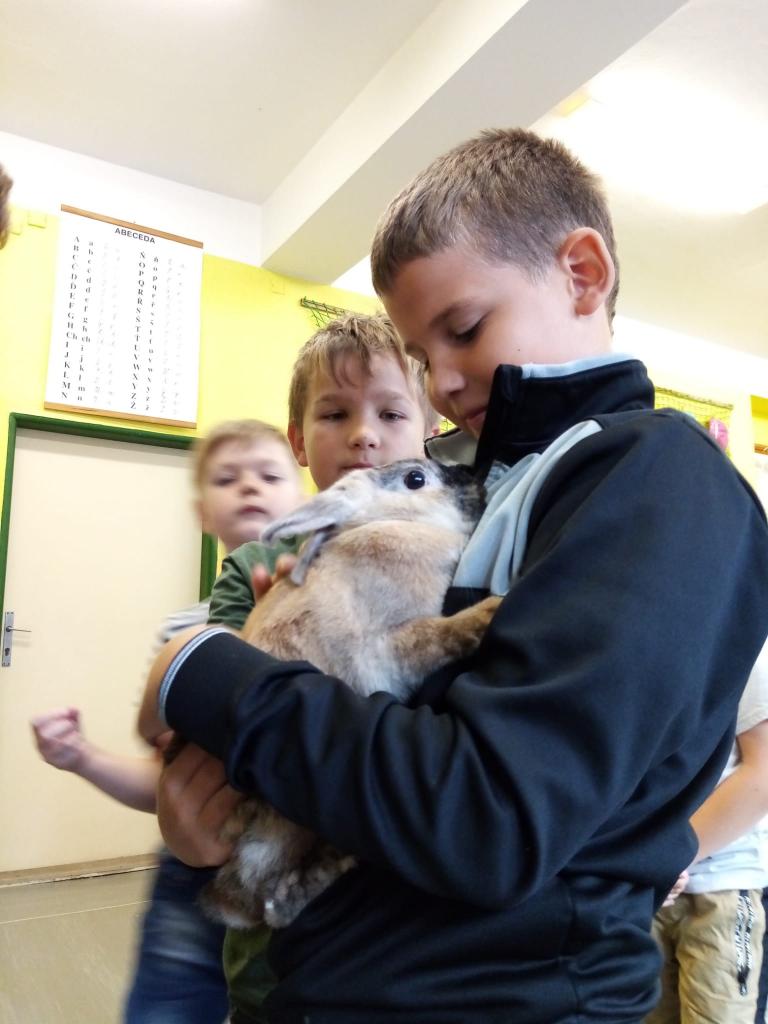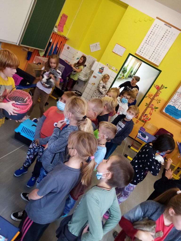 Už třetím rokem slavíme Den zvířat přímo ve škole. Osobně se přišli do třetí třídy podívat králíci, morčata, potkan, kanárek, rybičky a užovka červená. Venku nás pak čekala koza Růženka, labradorka Lilinka a čiperná Bibinka.