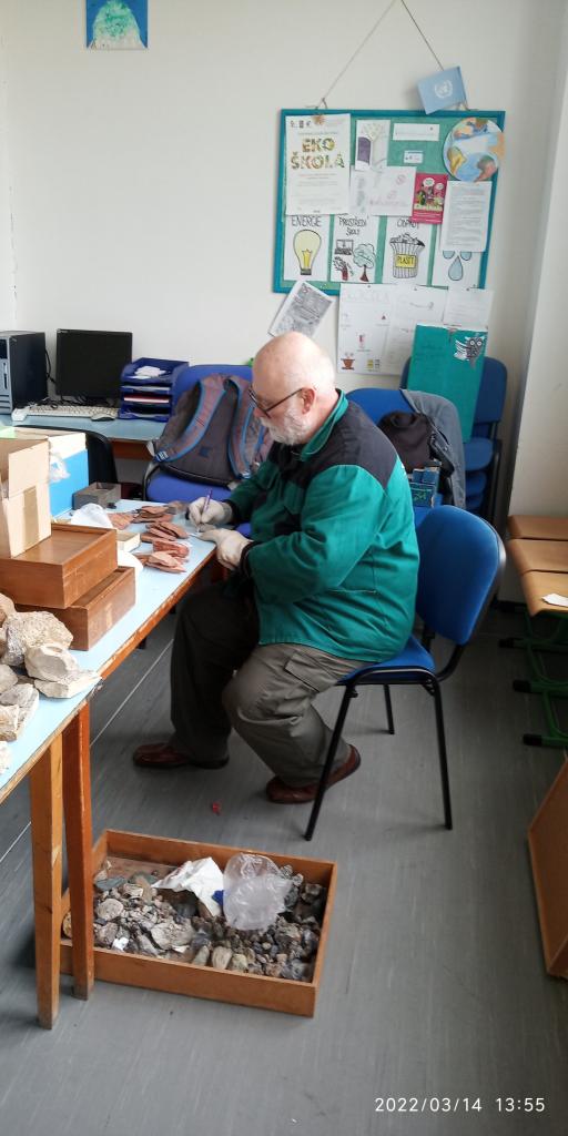 Bezplatně prohlédl celou školní sbírku minerálů, hornin a zkamenělin. A že jich máme! Na rozdíl od mnoha jiných škol jsme se totiž nikdy těchto starých sbírek nezbavili. Všechny vzorky prohlédl, určil jejich název i lokalitu, ze které pochází.