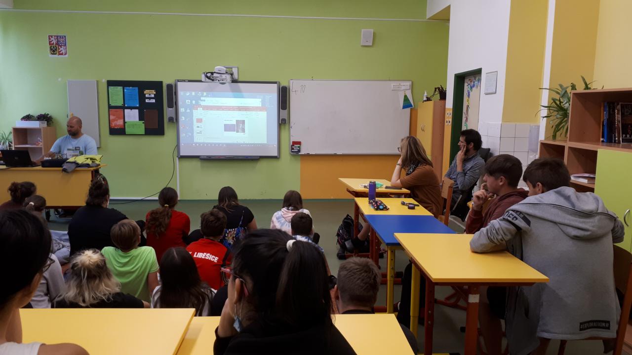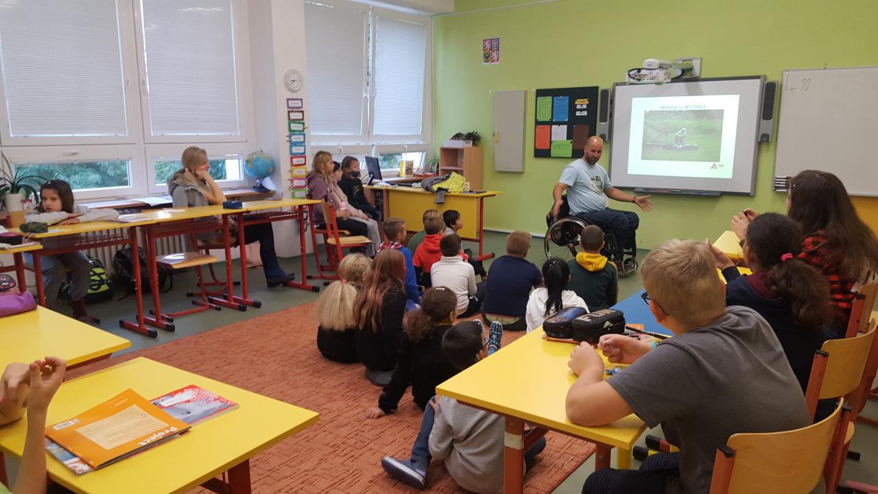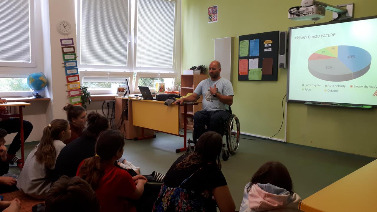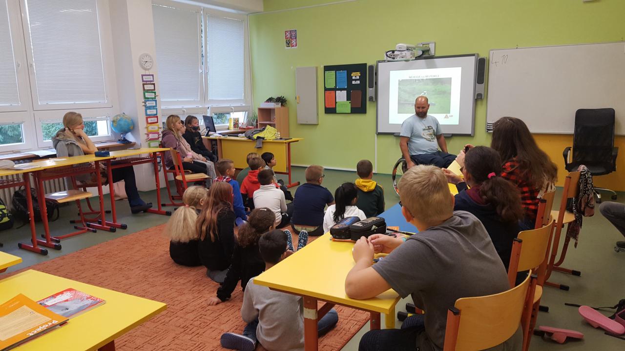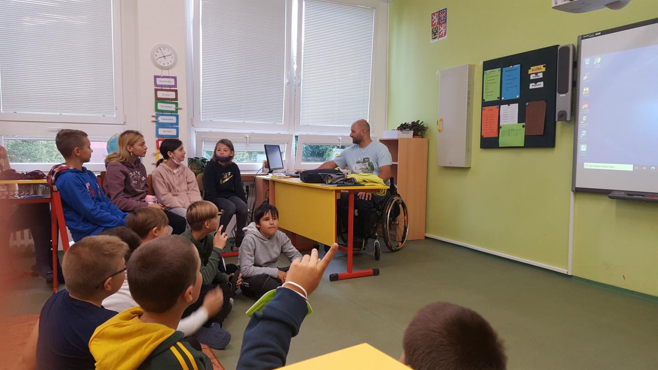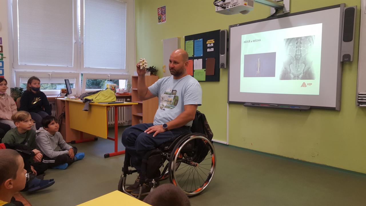 Dne 4. října 2021 jsme na škole uvítali jednoho z ambasadorů projektu Všeobecné zdravotní pojišťovny Honzu Krauskopfa. Na první pohled se od nás všech lišil - přijel totiž na invalidním vozíku. Jeho životní příběh a poutavé vyprávění o nehodě na motorce přikoval všechny žáky k židlím. Naprostou upřímností zboural všechny bariéry a zůstal u nás neplánovaně dokonce o 2 hodiny navíc... Jeho povídání složené z nepříjemných vzpomínek na nehodu, ale i malé lekce anatomie a funkčností lidského těla, pozitivních myšlenek na budoucnost či obrovského varování, jak blízko je každý z nás k životní tragédii, tak mohly slyšet dvě třídy navíc oproti původnímu plánu. Povedlo se, každého, kdo byl přítomný, příběh zasáhl. Otázkou zůstává, jak dlouho budeme schopní vnímat tento vztyčený prst, protože jak říkal Honza - tragédie je za pár vteřin, ale následky si nesete celý život.