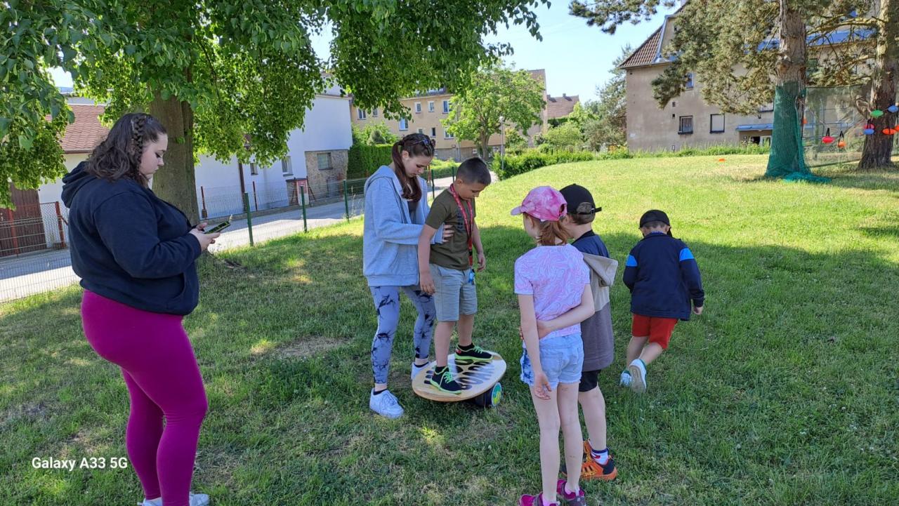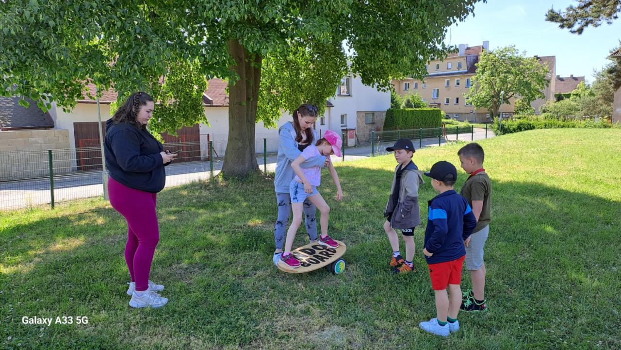Ve středu 31. května 2023 jsme si s deváťáky připravili pro prvňáky DEN DĚTÍ. Prvňáci procházeli 11 sportovními disciplínami. Vyzkoušeli si například skákání v pytli, běh v holínkách... Drželi rovnováhu na válci + prkně, na laně a chůdách. Házeli míčkem do koše, raketkou, mincemi do hrníčku v kýblu s vodou. Také plnili odměrný válec vodou, kterou přenášeli v proděravělém kelímku. Překonali určitý úsek s pin-pongovým míčkem na lžíci. Celé dopoledne se nám vydařilo a na závěr jsme prvňákům rozdali dárečky (bonbóny, balónky, hopíky a křídy).