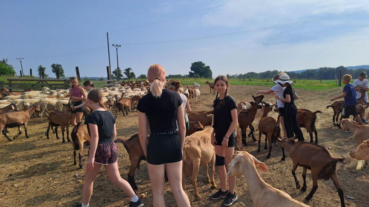 Ve čtvrtek 22. června 2023 jsme s žáky 6. třídy a EKOTÝMEM vyjeli na farmu Držovice. Tato akce byla částečně financovaná z projektu, kterým nás podpořila PRO-BIO LIGA pobočný spolek zastoupená Kateřinou Kotěrovou. Kozí a ovčí farma se zabývá výrobou sýrů a jiných mléčných výrobků. Tématem exkurze byla „cesta mléka“. Dozvěděli jsme se, jak se připravuje krmení, co zvířata jedí, o dojení, o mléce a výrobě sýra. Byl nám představen rozdíl mezi neekologickým a ekologickým zemědělstvím. Všichni žáci měli možnost nakrmit stádo koz starým pečivem a také jsme zjistili, že kozy jsou velmi kontaktní a vyžadují neustálé hlazení :)